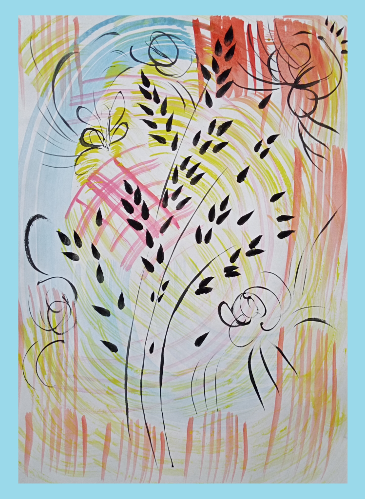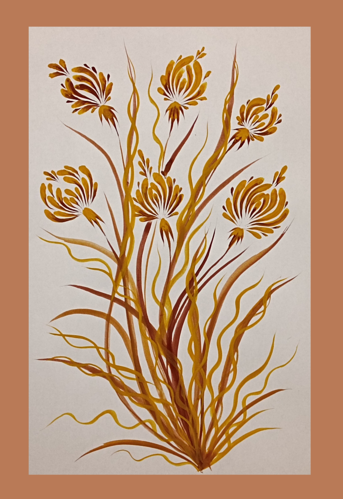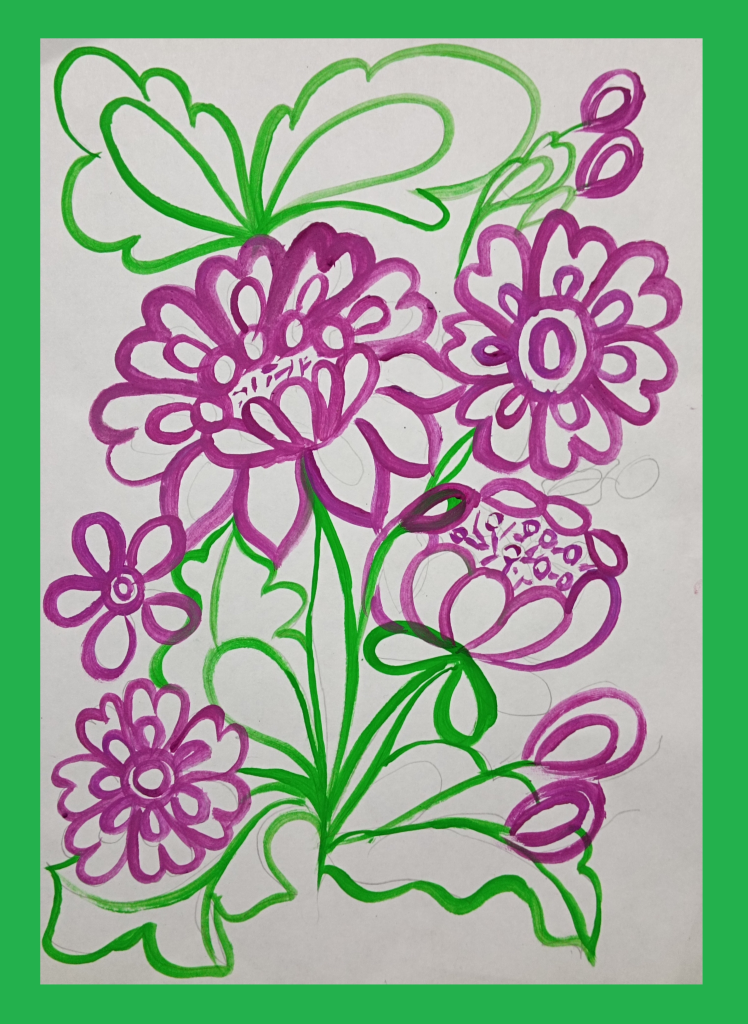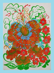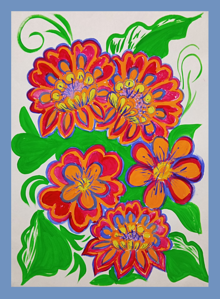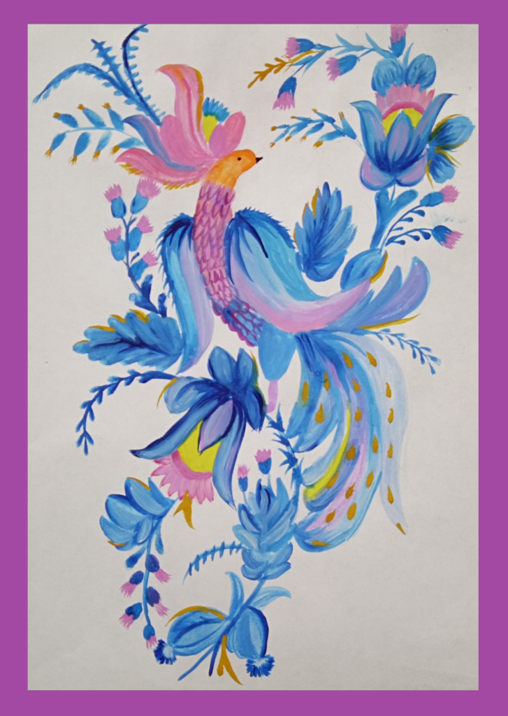 - петриківський розпис та декоративний живопис з елементами петриківського розпису: «Пташка у квітах», «Букет квітів», «Пані Квітка вділа буси», «Пшеничка»;