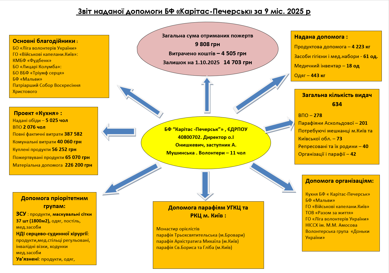 За 9 місяців 2025 року благодійна кухня Карітас надала 5 025 обідів, з яких 2 076 для внутрішньо переміщених осіб. Загальні фактичні витрати склали 387 582 грн, при цьому вартість пожертвуваних продуктів досягла 65 070 грн. Середня собівартість одного обіду становить 63,4 грн, що значно нижче ринкової вартості завдяки продуктовим пожертвам.За 9 місяців 2025 року благодійна кухня Карітас надала 5 025 обідів, з яких 2 076 для внутрішньо переміщених осіб. Загальні фактичні витрати склали 387 582 грн, при цьому вартість пожертвуваних продуктів досягла 65 070 грн. Середня собівартість одного обіду становить 63,4 грн, що значно нижче ринкової вартості завдяки продуктовим пожертвам.